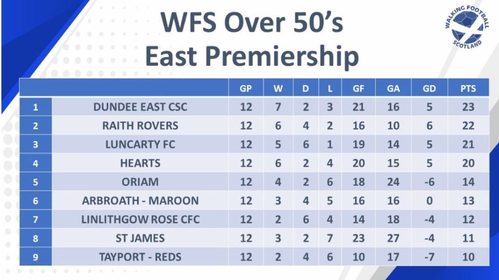 Raith over 50s went into the last round of fixtures in WFS’s East Region League on Sunday 27th October one point behind leaders, Dundee East, with each team having 4 games to play. Meanwhile a point behind Rovers lay Luncarty and lurking a further point back were Hearts. It was going to be a tight day.