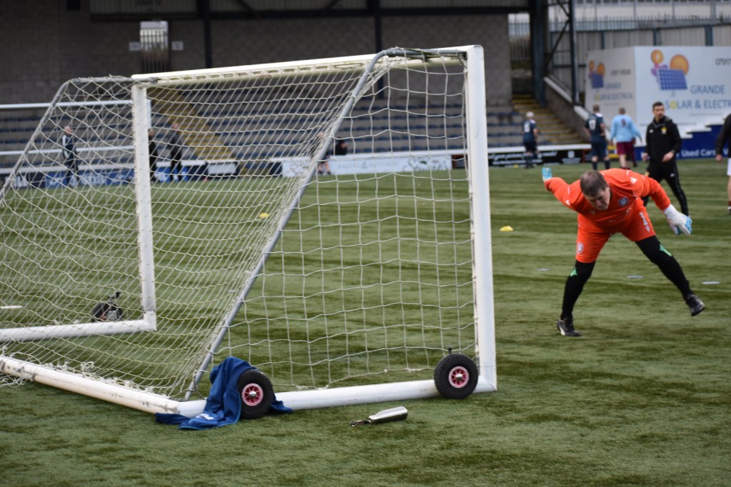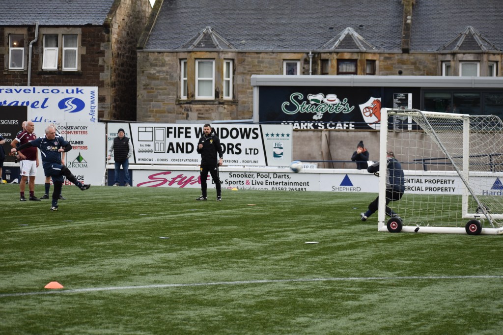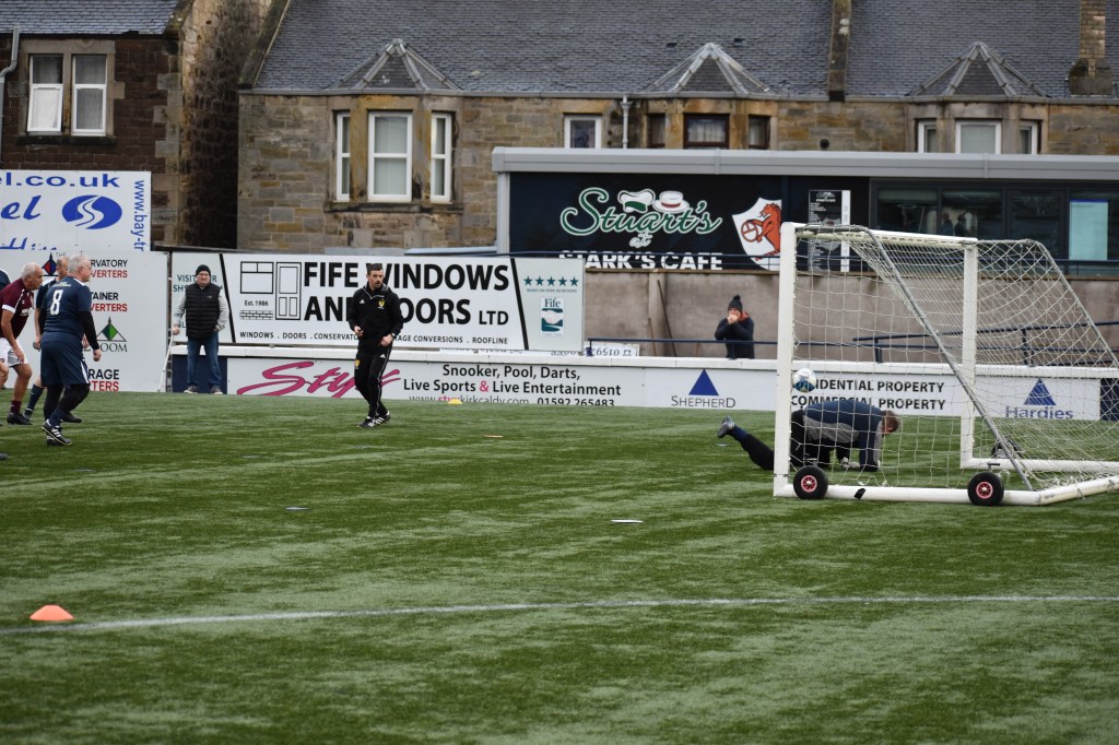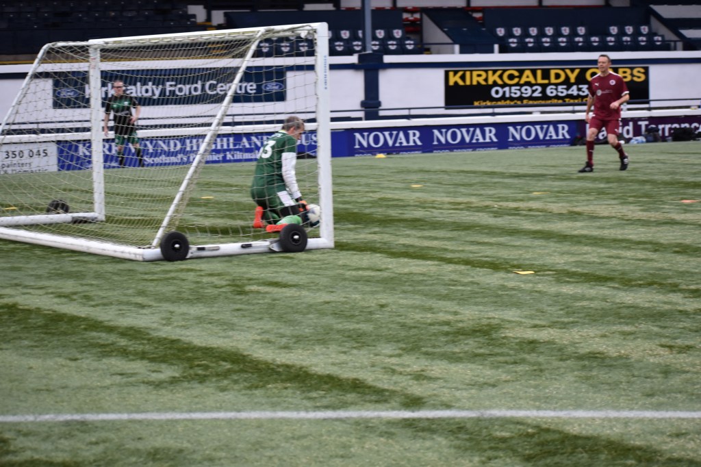 First up was second placed Arbroath and the game started poorly with Raith conceding a goal in under a minute. Parity was achieved in the second minute when Arbroath were penalised for a third non walking offence as referee Sean stamped his mark on how the game was going to be officiated. Ally Grant stepped up and scored the penalty. In six minutes Raith took the lead with a Neil Galloway shot through a defender’s legs that unsighted the Arbroath keeper. Yet, the inevitable third running offence for Raith raised its ugly head a minute later and Arbroath scored from the spot. In fourteen minutes some good interplay from the Raith front line saw the ball ending at Fraser’s feet and he confidently beat the keeper to give Raith, what looked like, a late winner. With the time running down an Arbroath shot from close range caught Ritchie on the arm and the ref awarded a penalty. How he was supposed to avoid the ball is anyone’s guess but the ref’s decision is final so… Arbroath score the penalty and end the game 3-3.